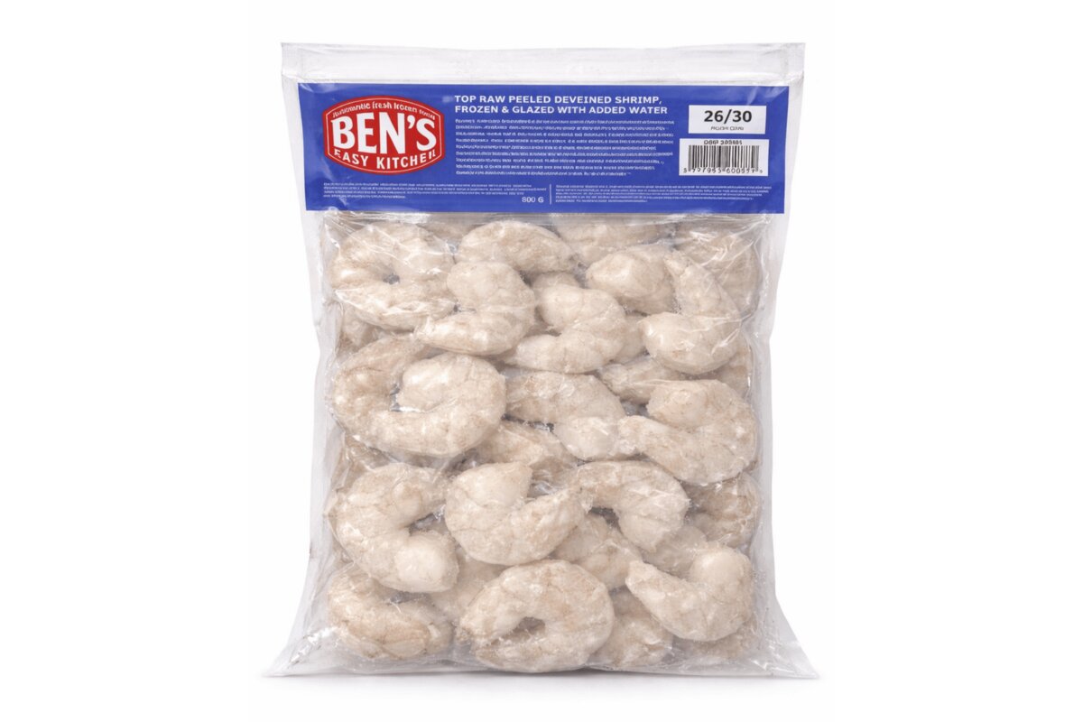 Krevety 26/30 vylúpané mrazené 800 g (s chvostom bez hlavy)/